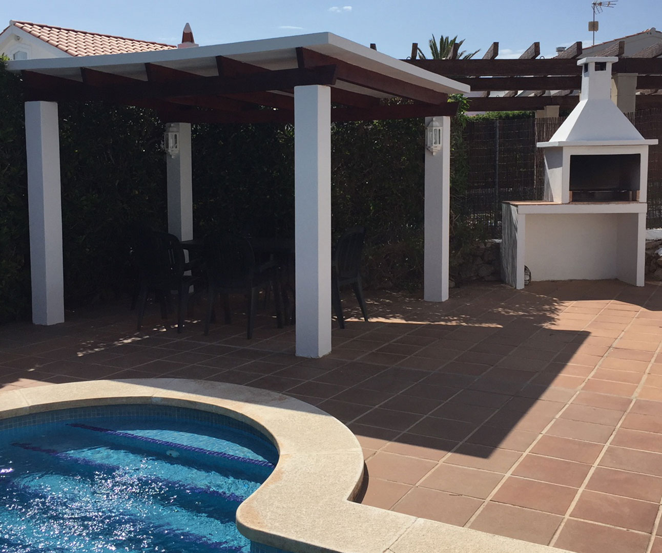 Air-con is available at an additional charge (pay to use meter facility). Outside: Secluded outside area with private pool (8m x 4m) for sole use of the residents. Paved patio area with a gazebo providing a shaded eating area and brick built barbecue. Sun loungers provided and their is facility at the side of the property for drying clothes. Utility Room: Seperate outside utility room includes washing machine and additional fridge freezer. Cleaning / Towels / Linen / Maid service: Towels and linen are provided and changed weekly. Other: Air-con available in two main bedrooms on a meter facility, floor safe, no pets or smoking is permitted in the property. Outside clothes line, sun beds and outside table and chairs for alfresco dining. Parking available opposite property or on driveway.
